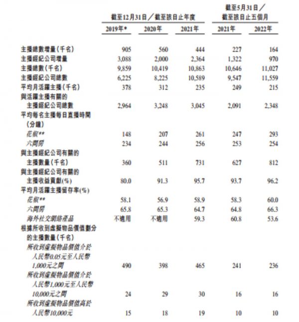 平均月活主播下降明显,月活主播留存率低。招股书显示,2019年、2020年、 2021年及截至2022年5月31日五个月,主播总数增量分别为90.5万人、56万人、44.4万人、16.4万人,增速下滑明显,平均月活主播分别为37.8万人、31.2万人、23.5万人、21.5万人,下滑明显,花椒的平均月活主播留存率保持至58-59%,六间房该数据优于花椒,保持在64-66%之间。