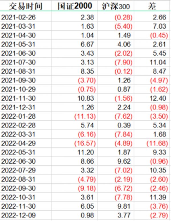 1、12月沪深300涨幅为正,且超过国证2000指数10个点以上,目前是2.79个点;
