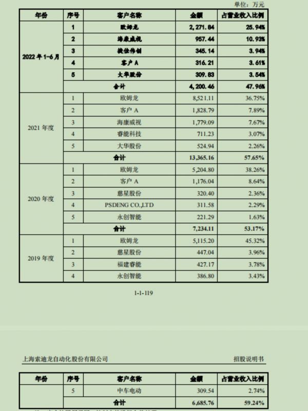 索迪龙收入主要来自大客户的订单,整年度的客户集中度在不断提高。据招股书,2019-2021年以及2022年1-6月,索迪龙来自前五大销售客户的金额分别为6685.76万元、7234.11万元、13365.16万元、4200.46万元,占各期营业收入比重分别为59.24%、53.17%、57.65%、47.96%。