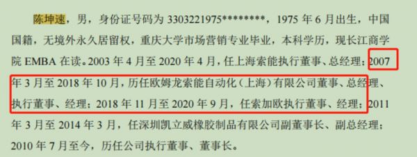 陈坤速有“欧姆龙”任职经历。资料显示,2007年3月至2018年10月,陈坤速任欧姆龙索能自动化(上海)有限公司董事、总经理、执行董事、经理;2018年11月至2020年9月,任索加欧(曾用名欧姆龙索能自动化(上海)有限公司)。索加欧为索迪龙曾经的全资子公司,已注销。
