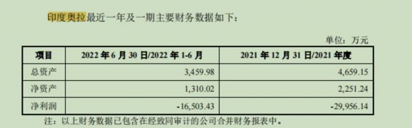 但印度奥拉的经营状况却十分糟糕。数据显示,2021年和2022年上半年,印度奥拉的净利润分别为-29956.14万元、-16503.43万元。截至2022年6月30日,收购印度奥拉产生的商誉金额为19816.17 万元,占公司资产总额比例为28.65%。