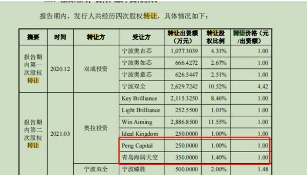 钛媒体APP注意到,在上述股权转让中,员工持股平台均以1元/出资额的低价受让公司股份。这里不得不提两名外部投资者Peng Capital、青岛海阔天空,也以同样的低价入股奥拉股份,股份占比分别为1%、1.4%。
