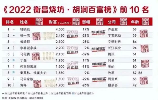 今年11月8日,2022年胡润百富榜正式公布。今年榜上首富仍是农夫山泉68岁的创始人钟睒睒。其名下财富比去年增长650亿元,以4550亿元第二次成为中国首富,创造了二十多年来中国首富财富的最高纪录。接下来是字节跳动创始人张一鸣以及宁德时代创始人曾毓群,分别为2450亿元,以及2300亿元。