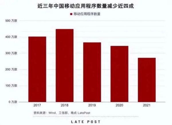 美国《连线》杂志网站当时发表文章称:“中国创新已超越其“快速跟进”名声。正以各种方式定义搜索、商业、社会、娱乐和广告等市场。中国的社交信息用户多于美国人口,科技巨头深知信息的价值,正密切关注用户如何通过手机交流。在中国,移动电商用户能通过手机管理其资金、打车,甚至投资货币市场基金。而在美国,此类活动远未像中国这样普及。”但随着后来4~5年,互联网公司的头部格局逐步形成,除了头条系通过抖音在互联网流量池中撕开了一道口子之外,流量红利以及创业空间正在肉眼可见的消失,留给其他玩家脱颖而出的机会越来越少。2018年是一个关键的时间拐点,根据晚点 LatePost的数据显示,从2018年之后到2021年,应用数量阶段性下行,到今年 10 月底只剩下 272 万款,净减少约四成移动应用。
