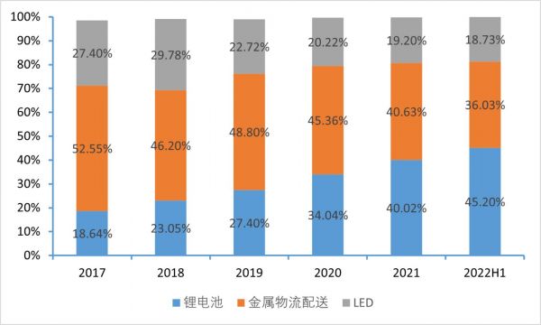 蔚蓝锂芯以金属物流配送起家,随后将业务拓展至锂电池和LED行业,近年公司锂电池业务占比逐渐增加,2022年上半年公司锂电业务收入占比达到45.2%,超过金属物流配送业务成为公司第一大业务收入来源。