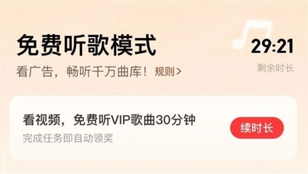 你喜欢听歌吗?如果答案是肯定的,那么你喜欢看广告吗?我想大多数人应该都不会喜欢。那么,如果看一次广告可以让你听30分钟VIP曲库呢?看广告换服务并不是什么罕见的事情,不少APP都提供类似的免费制度,让免费用户可以在需要时短暂体验VIP功能。