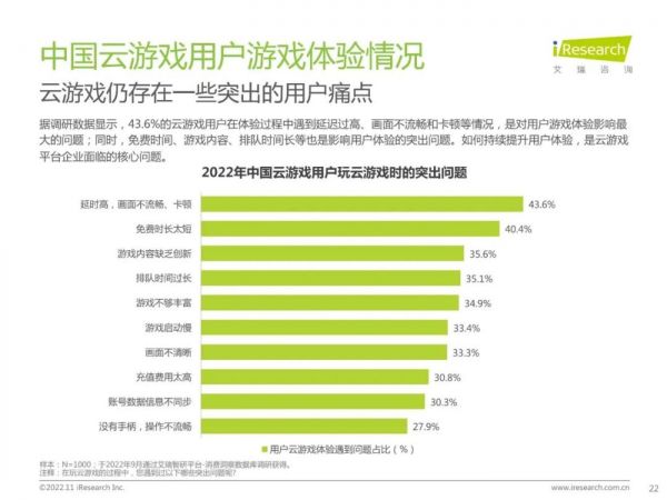 艾瑞咨询发表的《中国云游戏行业研究报告》中提及到,免费时长太短这一缺点被40.4%的用户认为是2022年中国云游戏的突出问题之一,另外还有延时高、画面不流畅、游戏内容缺乏创新、排队时间过长等问题。