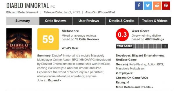 截至2022年12月,《暗黑破坏神:不朽》在知名游戏评分网站metacritic上的玩家评分已经跌至0.3分,是至今为止玩家评分最低的暴雪游戏,而从玩家们的评论中,我们可以轻易发现《暗黑破坏神:不朽》隐藏在目前高流水背后的各种缺陷。