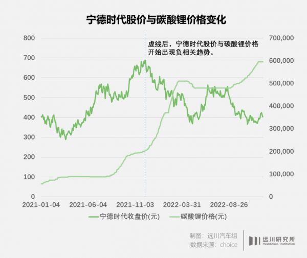 2021年12月后,宁德时代股价与碳酸锂价格基本呈负相关
