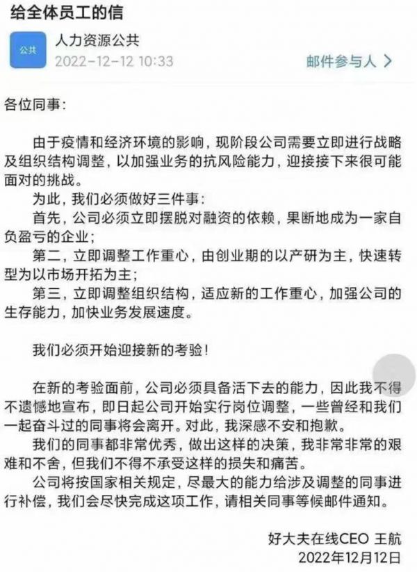 话音刚落。12月初,业内流传出一封由好大夫在线CEO王航发出的《给全体员工的信》。其中第一条就是:公司必须立刻摆脱对融资的依赖,果断成为一家自负盈亏的企业。这恐怕对于所有创业公司都适用。