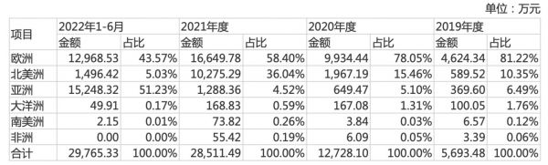 报告期内,望圆科技来自欧美地区的收入占主营业务收入的比例均超过90%。今年上半年,公司北美销售额下滑主由于自2021年末起,应第一大客户元鼎智能要求,双方交易模式由公司出口至境外改为客户向公司采购后自行报关出口,不过这些产品的最终消费地仍主要为北美地区。