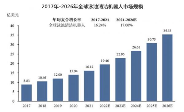 从行业前景来看,市场预计仍存在增长空间。一方面,近几年全球泳池数量呈持续增长趋势,推动泳池清洁机器人市场规模持续扩张。根据灼识咨询发布的《全球及中国泳池清洁机器人行业蓝皮书》,2017年全球泳池清洁机器人行业市场规模为8.83亿美元,2021年全球泳池清洁机器人行业市场规模为16.12亿美元,2017年至2021年年均复合增长率为16.24%。预计2026年全球泳池清洁机器人市场规模将达到35.33亿美元。