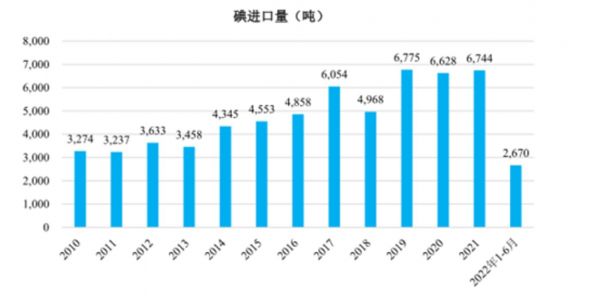 钛媒体APP注意到,博苑股份的毛利率主要受碘市场价格提升带来产品价格上涨的影响。根据海关总署相关数据,2019年至2022年1-6月碘进口金额分别为12.57亿元、15.43亿元、14.32亿元和7.37亿元。2010 年至 2022 年 1-6 月,我国碘进口量总体呈增长趋势,具体情况如下: