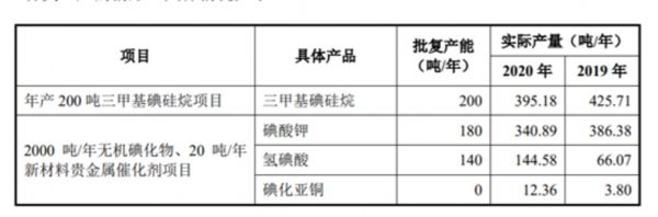 钛媒体APP注意到,博苑股份还拥有两件“无厘头”的事件。2019年和2020年,博苑股份三甲基碘硅烷、碘酸钾、氢碘酸存在远超产能的生产,特别是2019年三甲基碘硅烷、碘酸钾的产能利用率更是突破了200%。与此同时,碘酸钾、氢碘酸存在超产能生产、碘化亚铜存在超种类生产的情形。