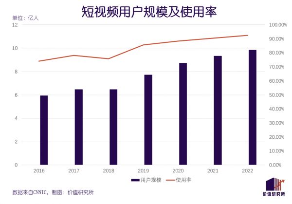 来自CNNIC的报告预测,截止2022年12月底短视频用户规模约为9.85亿人,网民使用率超过92%,同比增长近两个百分点。来自索福瑞的数据则指出,短视频用户群分布广泛,从青少年到银发一族全都是其忠实拥趸。其中,10岁及以下网民的短视频使用率达到90.4%,50岁及以上中老年用户的使用率也超过30%。