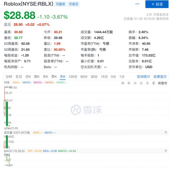 此外,Roblox第三季度亏损2.978亿美金,相比去年同期7400万美金亏损扩大3倍,并且,三季度Roblox的DAU(日活)为5880万,同比增长24%,增速相比去年同期的31%有所下滑,同时平均每DAU的Bookings收入为11.94美元,同比下降11%。截至2022年12月31日,Roblox报收28.46美元,年内累跌71.2%。