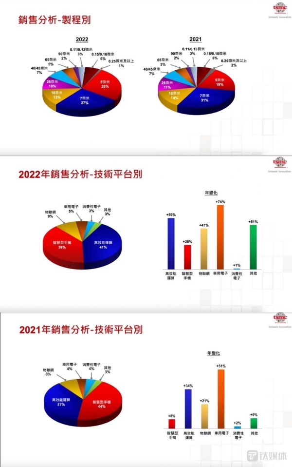 以技术平台来看,四季度,台积电高性能计算营收占比42%,智能手机占比38%,物联网、车用电子、消费性电子占比分别为8%、6%、2%;去年全年,高性能计算和智能手机芯片合计收入占比达到80%,比2021年有所下滑,同时,车用电子年增长高达78%、高性能计算年增59%、物联网业务年增47%,为台积电核心增长动能领域。