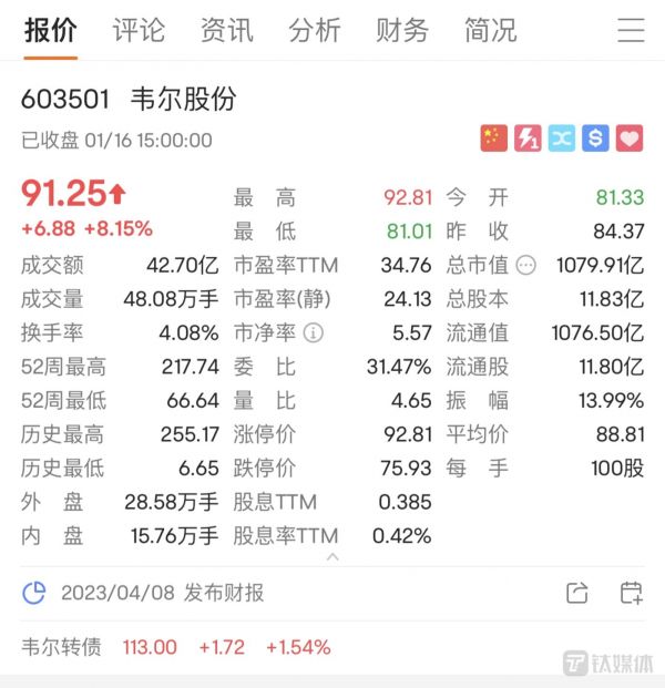 1月16日上午,韦尔股份开盘跌超3%,随后股价回落、由跌转涨。截止16日下午15点收盘,收涨8.15%,报91.25元/股,总市值约1080亿元。