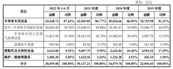 随着市场规模的扩张,近年来公司的营收也实现了快速增长,2019年至2021年年均复合增长率达 47.34%。报告期内,公司的营业收入分别为2.31亿元、3.49亿元、5.01亿元和3.92亿元。其中,半导体专用温控设备、半导体专用工艺废气处理设备合计贡献收入1.86亿元、2.97亿元、4.34亿元和3.27亿元,占公司总收入的比例分别为80.52%、85.10%、86.63%和 83.42%,相比之下晶圆传片设备存在感较低。
