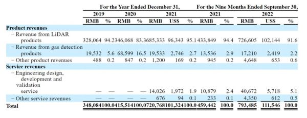 从2019年到2022年前9个月,激光雷达销售收入分别为3.28亿、3.46亿,6.85亿和7.27亿元人民币,在整体收入中分别占比94.2%、83.6%、95.1%和91.6%。