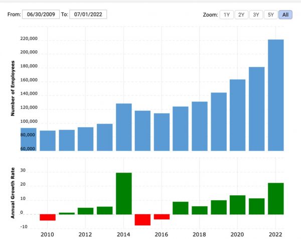 不过,即便是进行了大规模裁员,这些科技公司的员工总数依然明显高于2021年的水平。换句话说,科技公司现在的裁员只是抹去了过去一年扩招的一部分员工,大部分企业裁员之后的员工总数依然高于2021年底的数字。