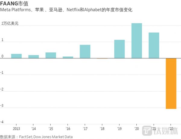 而且,资本市场持续动荡。2022年,美国股市的许多昔日宠儿魅力不再。去年,Meta大跌64%;Netflix重挫51%。2022年全年,FAANG股票——Meta、亚马逊、苹果、Netflix、和谷歌母公司Alphabet五家科技巨头的市值总计蒸发超过3万亿美元。而且,科技股大跌拖累了整个市场,标普500指数去年全年下挫19%,创2008年金融危机以来最糟糕的年度表现。