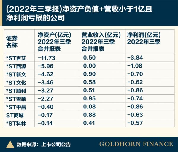 比如此前已连续三年亏损的*ST吉艾,2022年三季度末的营业收入、扣非净利润和净资产分别为0.5亿元、-3.71亿元和-11.68亿元。