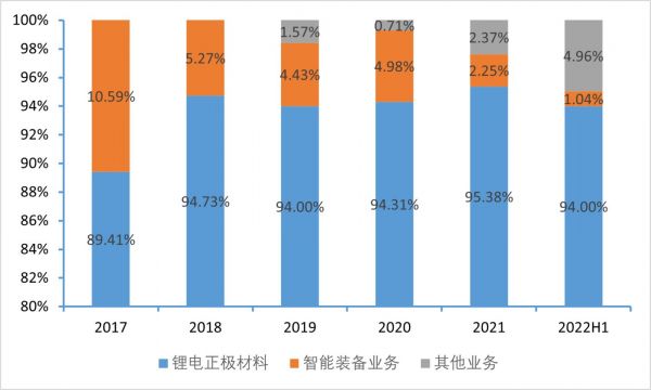 公司于2002年进入锂电正极材料领域,2015年并购中鼎高科进入自动化装备领域,目前锂电正极材料业务为公司主要收入来源,2022年上半年锂电正极材料收入占公司总营收的94%。