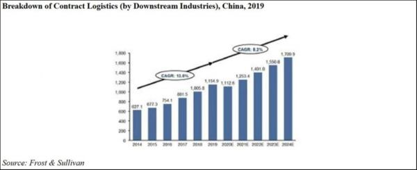 根据Frost & Sullivan数据,中国的合同物流产业在最近几年获得长足发展,从2014年约6271亿元人民币增长至2019年达1.15万亿元人民币,年复合增速为13%。同时,由于仓储和供应链管理的升级,预计中国的合同物流产业将继续扩大。预计到2024年将达到1.71万亿元人民币,2019-2024年复合增速为8.2%。