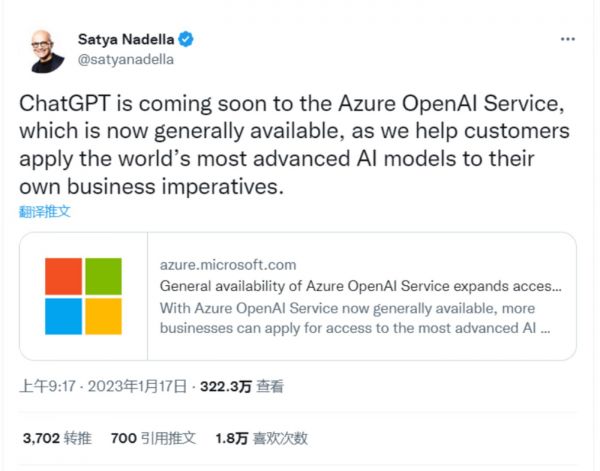 微软公司CEO萨蒂亚・纳德拉 (Satya Nadella) 发布推文称:“在我们帮助客户将世界上最先进的人工智能模型应用于他们自己的业务需要时,ChatGPT 很快就会出现在Azure OpenAI服务中,该服务现在已经普遍可用。”