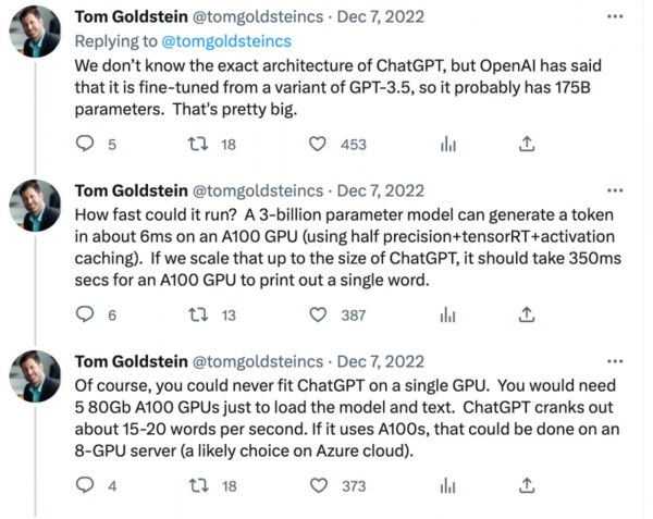 AI学者Tom Goldstein曾算了笔账,按照ChatGPT是基于GPT3.5的说法,它的参数量可能为1750亿。因此大约需要5个80GB的A100来加载模型和文本,ChatGPT每秒钟能产生大约15-20个单词,如果它使用A100,那么可以在8-GPU服务器上完成。