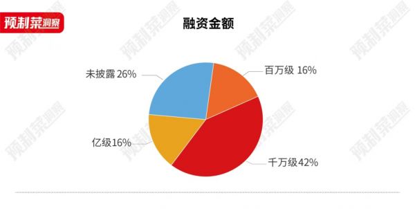 从融资金额来看,2022年预制菜企业获融资金额大多集中在千万级别,共13起,占比约42%。另外,百万级和亿级融资项目各5起,共占比32%。