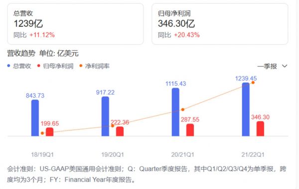 尤其是2022财年Q1,苹果营收为1239.45亿美元,创有史以来最高的单季度营收,与去年同期相比增长11%。