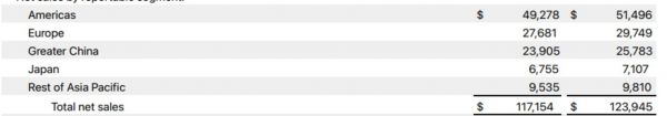而在市场竞争方面,苹果也面临不小的冲击。2023第一财季,美国、欧洲等地销量都同比下降,其中,大中华区作为苹果的第二大重要市场,同比下降7%,营收为239亿美元。