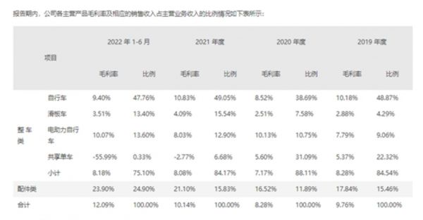对此,永祺车业解释称,公司主要通过对客供以及其他外购的原材料和配件进行组装加工形成共享单车。公司于2021年调整业务结构,减少共享单车出货量,共享单车单价较低且利润低,从而分摊制造费用、人工成本偏高,造成毛利为负,2022年上半年出货量较小,故成本分摊制造费用较多,毛利率下降较多。