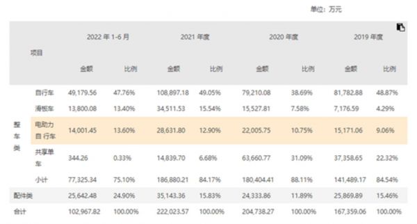 2019年-2021年以及2022年上半年(以下称“报告期内”),永祺车业的自行车业务分别实现收入8.18亿元、7.92亿元、10.89亿元和4.92亿元,占主营业务收入的比例分别为48.87%、38.69%、49.05%和47.76%,是公司主营业务收入的最重要来源。