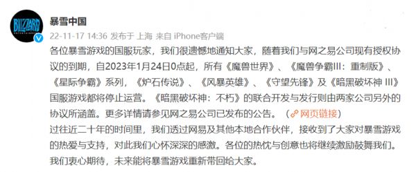 2022年11月17日,暴雪侧单方面发出公告,称除《暗黑破坏神:不朽》外的暴雪游戏因授权协议到期,将于2013年1月23日后暂停服务。此后网易方面发出公告,证实了双方在续约问题上未能达成一致,将着手关停暴雪游戏国服并安排退款,暴雪和网易的合作迎来终结。