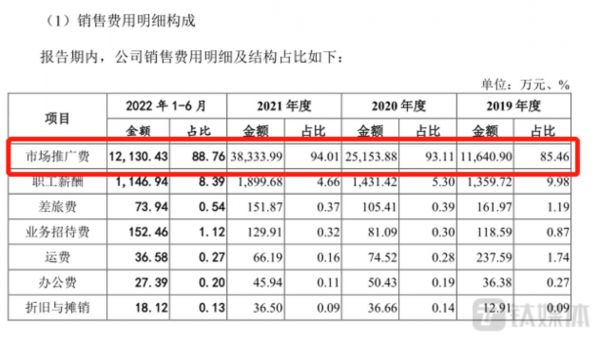 再从销售费用的细分领域看。报告期内,穗绿十字的市场推广费用分别为11640.9万元、25153.88万元、38333.99万元、12130.43万元,分别占当期销售费用的85.46%、93.11%、94.01%、88.76%。