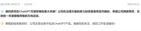 Chatbot与ChatGPT类似,都是自然语言处理技术,不过Chatbot已经是好几年前的技术了。好在福石控股比较诚实,在互动平台公司就明确表示,公司主营业务不包含ChatGPT产品,公司主营业务不包含AI智能聊天机器人产品。