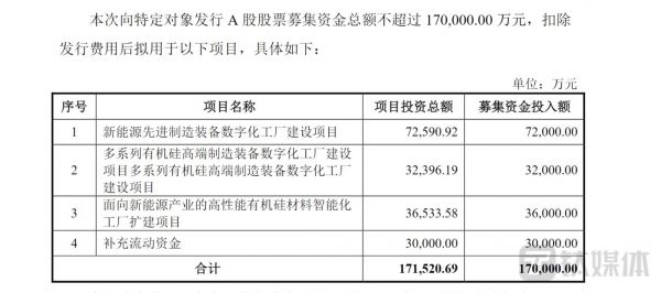 公司此次拟定增募资不超过17亿元,规模是上次定增的14倍,其中7.2亿元用于投入新能源先进制造装备数字化工厂建设,占比约42.35%,该项目主要用于扩充锂离子电池先进制造装备及锂云母提取电池级碳酸锂装备产品的产能(下称锂云母提锂项目);3.2亿元投入有机硅高端制造装备领域、3.6亿元投入有机硅材料领域,3亿元用于补充流动资金。