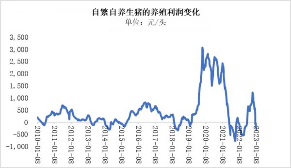 2022年7月1日,一头自繁自养生猪的养殖利润好不容易从过往的猪肉价格暴跌中恢复过来,达到了200.35元/头,但仅仅经历了4个月左右至2022年10月末超千元一头的利润后,其养殖利润就开始持续下跌,2022年12月23日就处于亏损状态,为-66.75元/头,随后一直下跌到2023年1月20日的-317.76元/头。