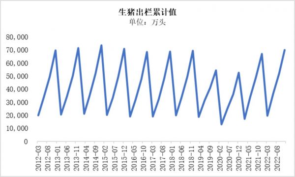 而2022年12月,生猪出栏累计值更是达到了69995万头,为2016年以来的最高值。
