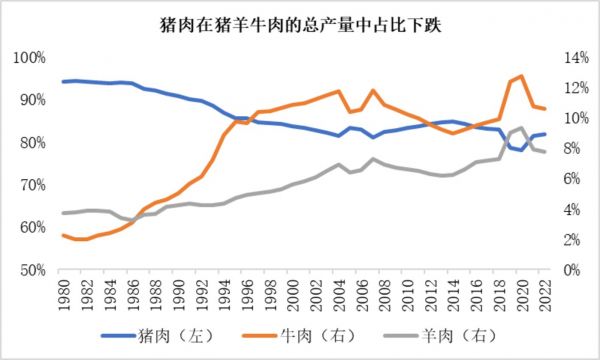 从猪肉在猪羊牛肉总产量的占比来看,虽然猪肉比例仍保持高位,但已呈现逐步下跌趋势,反而是牛羊肉产量占比整体连年上涨。