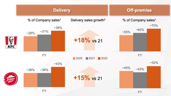 能在压力中保持韧性,“非堂食业务”是重中之重。“非堂食业务”包含外卖、外带等业务,根据官方信息,肯德基外卖业务销售额较2021年提升了18%,必胜客提升了15%。2022年,肯德基“非堂食业务”销售占比达到了70%,必胜客达到了52%。