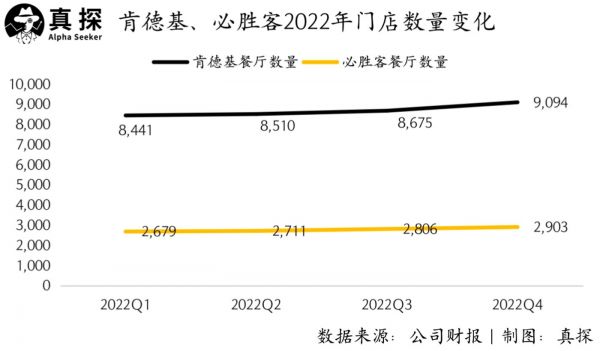 四季度通常是开店旺季。财报中,杨家威表示,公司四季度净新增538家门店,创下了新纪录,同时保持“健康的新店回报率”。2022年全年,肯德基和必胜客的门店数一直保持正增长。财报显示,截至2022年年末,肯德基共有餐厅9094家,2021年同期为8168家;必胜客共有餐厅2903家,2021年同期为2590家。