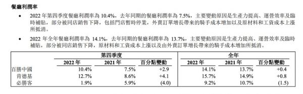 利润层面,2022年四季度,百胜中国的餐厅利润率从上年同期的7.5%提升到了10.4%,全年餐厅利润率则从13.7%提升至14.1%。