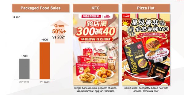 肯德基和必胜客的另一个收入增长点来自包装食品销售,如“肯德基自在厨房”系列,必胜客的整切西冷牛排、和牛牛肉饼等产品。这项业务迎合了消费者居家用餐的需求,公司资料显示,包装食品的销售较2021年实现了50%的增长。
