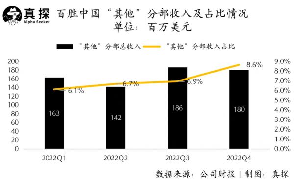 财报显示,2022年第四季度,“其他”分部实现总收入1.8亿美元,占公司总收入的比例为8.6%,占比呈现上升趋势。在利润和扩张方面,“其他”分部的表现相对逊色。财报显示,四季度,百胜中国“所有其他分部”的经营亏损为1100千万美元。截至2022年年末,“其他”分部共有门店950家,较2021年年末的1030家有所下滑。