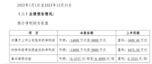 近日,汉王科技披露的业绩预告显示,预计2022年度归属于上市公司股东的净利润为亏损14000万元—9800万元,而上年同期为盈利5409.49万元。