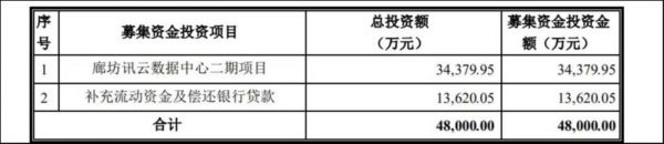 “市场表示热点可以蹭,但募资还是要拿实力说话”。钛媒体APP注意到,2019年奥飞数据曾计划定增,于2020年11月成功募集到4.8亿元。这4.8亿元主要用于建设廊坊讯云数据中心二期项目(下称廊坊讯云二期)项目、补充流动资金及偿还银行贷款两方面,投资资金分别为3.44亿元、1.36亿元。